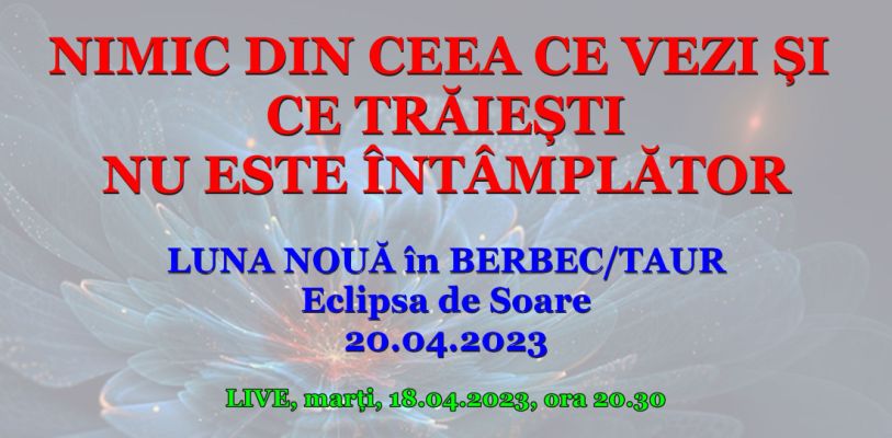 Joi, 20.04.2023, vom avea parte de un moment special, deloc întâmplător: a doua Lună Nouă în Berbec, și prima în Taur, precum și de o eclipsă de Soare. Ce înseamnă asta, cum poți recunoaște mesajele primite și cum poți interpreta „coincidențele”, voi vorbi în cadrul unei emisiuni în direct marți, 18.04.2023, de la ora 20.30, transmisă pe canalul meu YouTube și pe pagina mea Facebook.