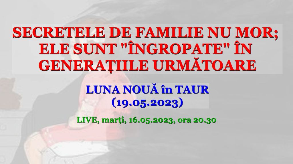 Luna Nouă în Taur din 19 mai ne atrage atenția asupra acestor schimbări majore ce au deja loc. Despre aceste subiecte voi povesti în cadrul unei emisiuni în direct transmisă marți, 16.05.2023, de la ora 20.30. pe canalul meu YouTube și pe pagina mea Facebook.