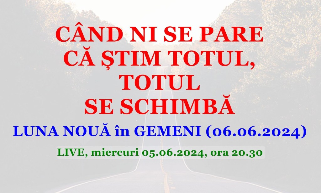 Noul început este „apanajul” Lunii Noi în Gemeni, zodie guvernată de Mercur, planeta comunicării. Tema este „te lauzi? fă ce spui!”. Mai multe despre toate acestea voi vorbi în cadrul unei emisiuni în direct transmisă miercuri, 05.06.2024 de la ora 20.30 pe pagina mea Facebook și pe canalul meu YouTube. Te aștept cu drag.