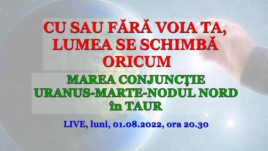 CU SAU FĂRĂ VOIA TA, LUMEA SE SCHIMBĂ ORICUM MAREA CONJUNCȚIE URANUS-MARTE-NODUL NORD în TAUR Avem noi, așa, o credință cum că dacă nu suntem de acord cu ceva sau cu cineva, lumea va rămâne neschimbată, va rămâne așa cum ne place, ca și cum am avea o superputere de a îngheța timpul și energia …