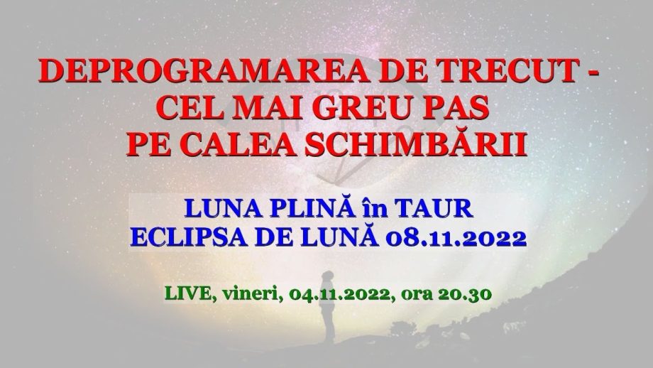 DEPROGRAMAREA DE TRECUT, CEA MAI MARE PIEDICĂ ÎN CALEA SCHIMBĂRII Luna plină în Taur. Eclipsa de Lună "Ce să deprogramez, că io n-am niciun program", s-ar putea să gândești citind titlul. Aha, tu încă mai crezi că tot ceea ce faci și spui este emanație proprie, nu program moștenit din familie. Mda... Cu toții suntem …