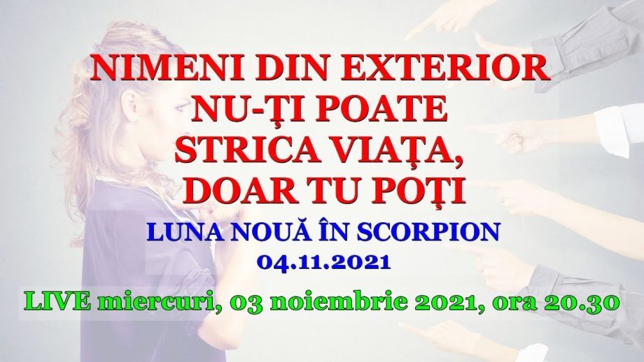 NIMENI DIN EXTERIOR NU-ȚI POATE STRICA VIAȚA, DOAR TU POȚI Luna Nouă în Scorpion 04.11.2021 Există o părere comună cum că noi nu suntem de vină pentru viața noastră, pentru deciziile noastre, doar alții sunt vinovații de serviciu. Întregul sistem de educație are ca pilon central arătarea cu degetul spre exterior, spre afară, către alții. …