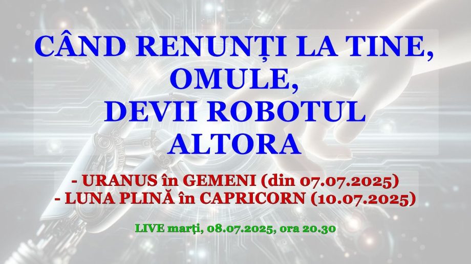 CÂND RENUNȚI LA TINE, OMULE, DEVII ROBOTUL ALTORA - URANUS în GEMENI (din 07.07.2025) - LUNA PLINĂ în CAPRICORN (10.07.2025) Ce înseamnă să renunți la tine? Înseamnă să nu îți mai pese ce simți și ce vrei cu adevărat pentru că te-ai hotărât că alții sunt și vor fi mai importanți pentru tine. Înseamnă să …